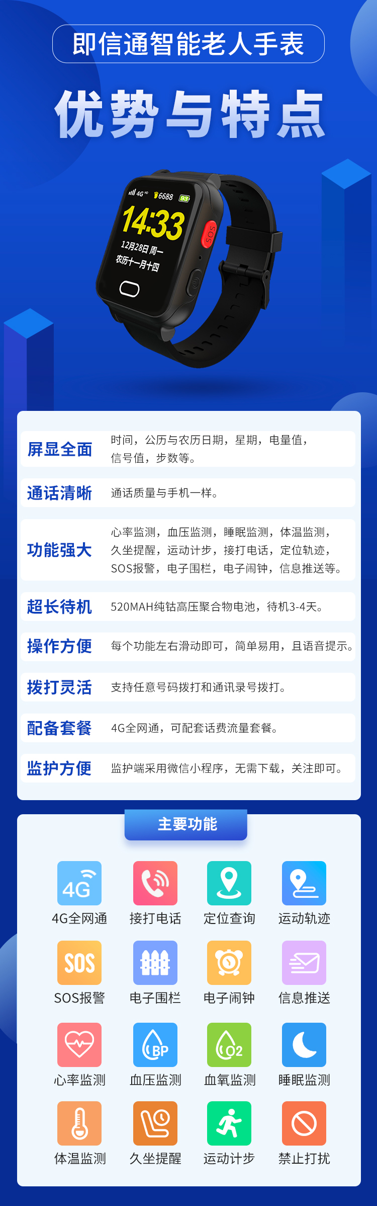 3.       功能強大:心率監測,血壓監測,睡眠監測,體溫監測,久坐提醒,運動計步,接打電話,定位軌跡,SOS報警,電子圍欄,電子鬧鐘,信息推送等等。